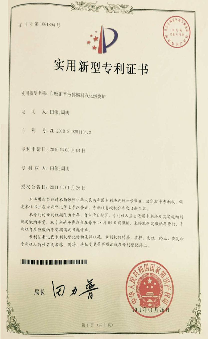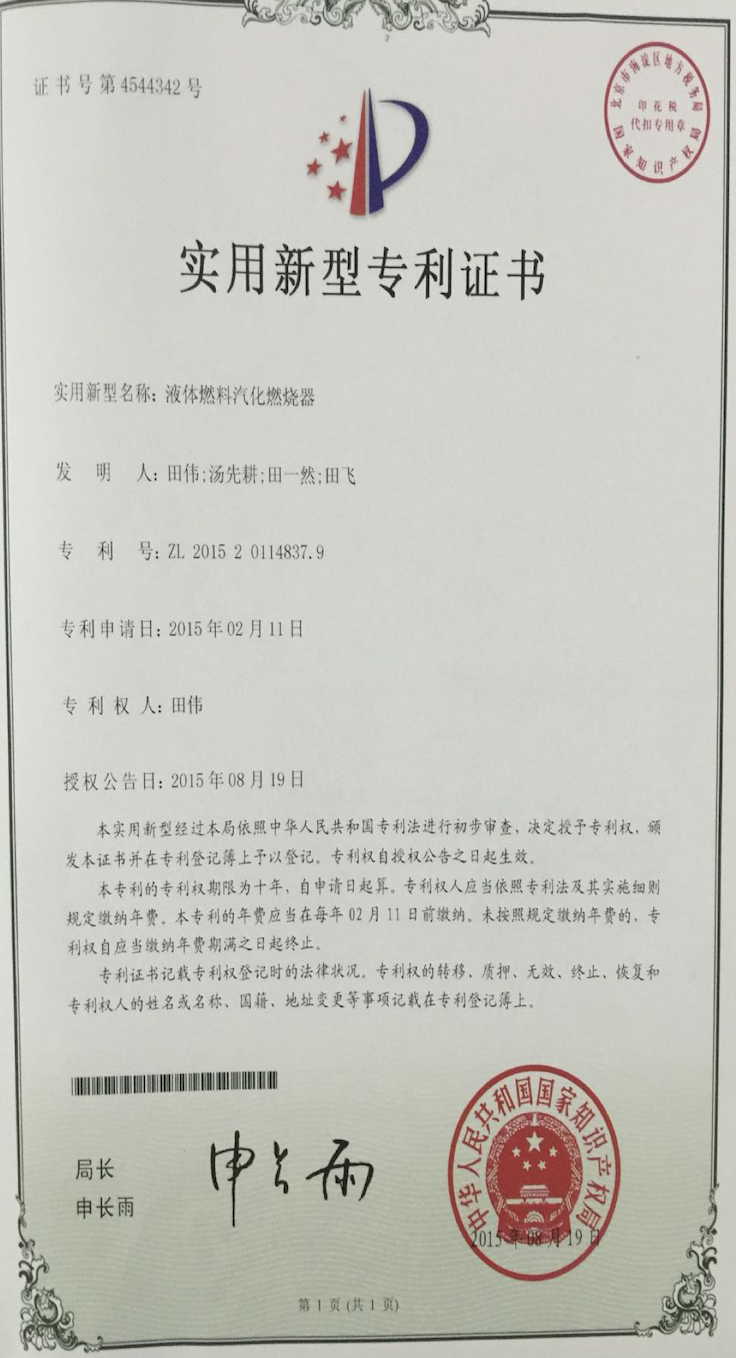 ???????企業(yè)研發(fā)團(tuán)隊經(jīng)過多年來對改性甲醇車用燃料的深入研究,成功的研發(fā)出改性甲醇車用燃料在各種點燃式發(fā)動機(jī)上的使用,研發(fā)出具為獨(dú)特性能的改性劑和熱值劑,發(fā)明專利ZL202110552744.4(一種含有改性劑和熱值劑的改性甲醇用復(fù)合添加劑及其應(yīng)用)、ZL202110384160.0(一種點燃式車用改性甲醇燃料及其制備方法)、ZL202110461619.2(一種壓燃式改性甲醇燃料及其制備工藝)、ZL202310578298.3(一種工業(yè)領(lǐng)域用改性甲醇燃料及其制備方法)和ZL2023104788592(一種民用領(lǐng)域用改性甲醇燃料及其制備方法)以及相匹配的改性甲醇民用燃燒器均獲得國家專利局授權(quán)。